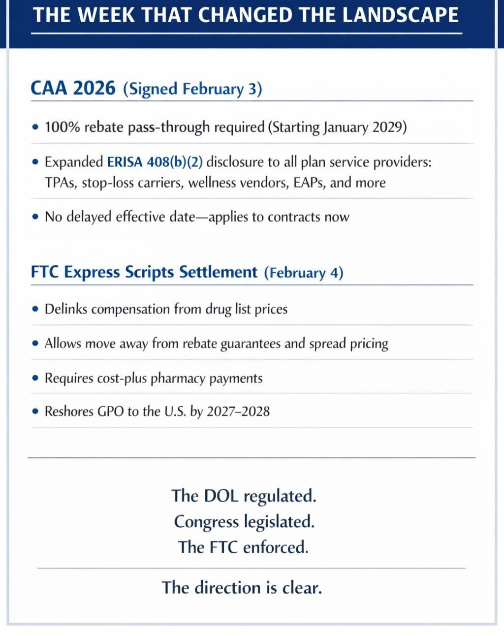 The DOL’s proposed rule was one of three separate federal actions on PBM transparency in a single week. On February 3, the President signed CAA 2026 into law, mandating 100% rebate pass-through. On February 4, the FTC settled with Express Scripts, requiring structural overhaul of how the largest PBM prices drugs and reports to plan sponsors.