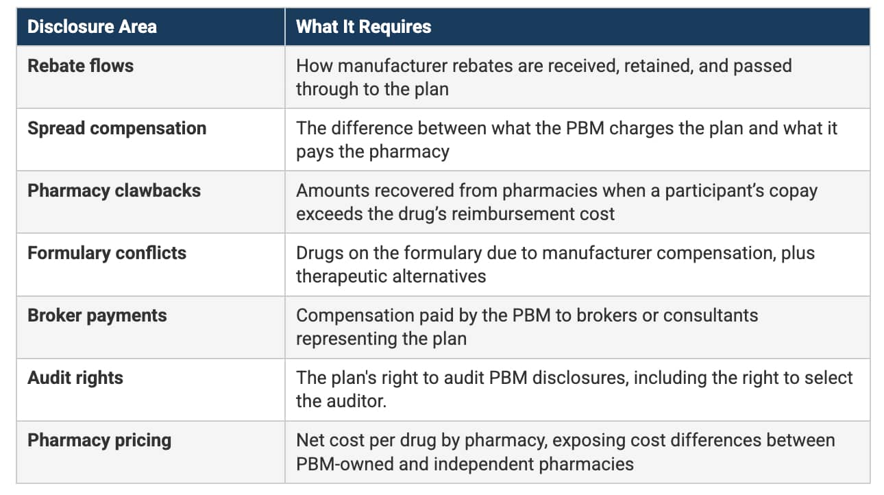 The rule requires PBMs to disclose compensation but says nothing about plan sponsor access to the underlying claims data. Transparency without data access is incomplete. A fiduciary cannot independently verify PBM disclosures, conduct meaningful audits, or evaluate alternative arrangements without unrestricted access to their own plan's data.