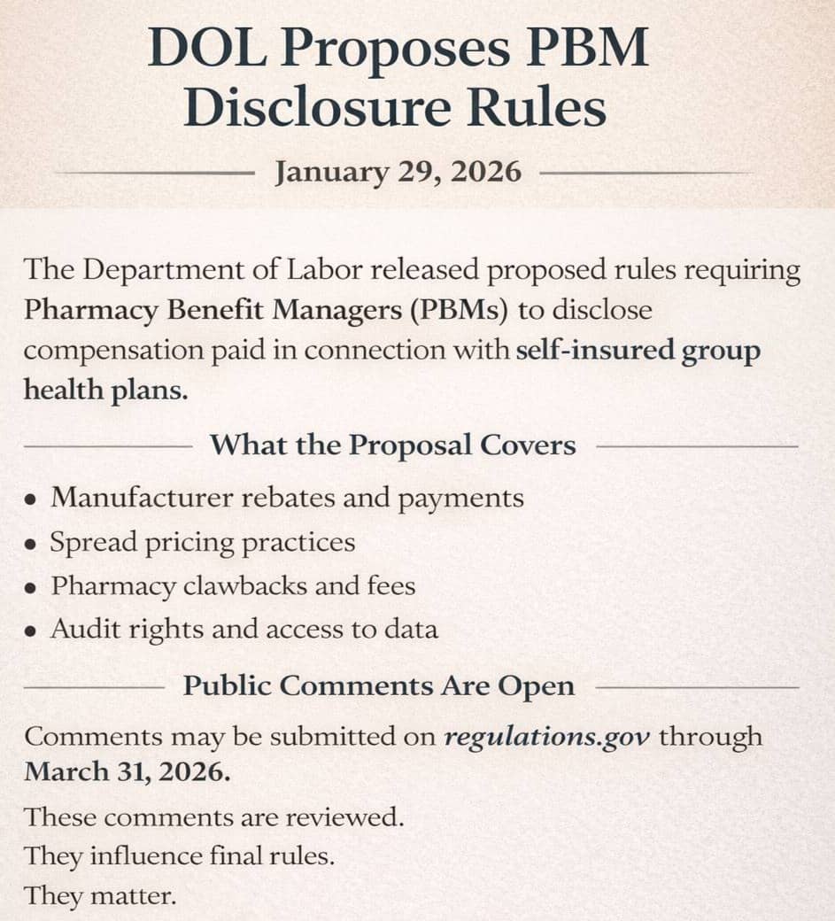 P.S. We got some good news from Washington late last week. On January 29, the Department of Labor proposed rules requiring PBMs to disclose compensation to self-insured group health plans.