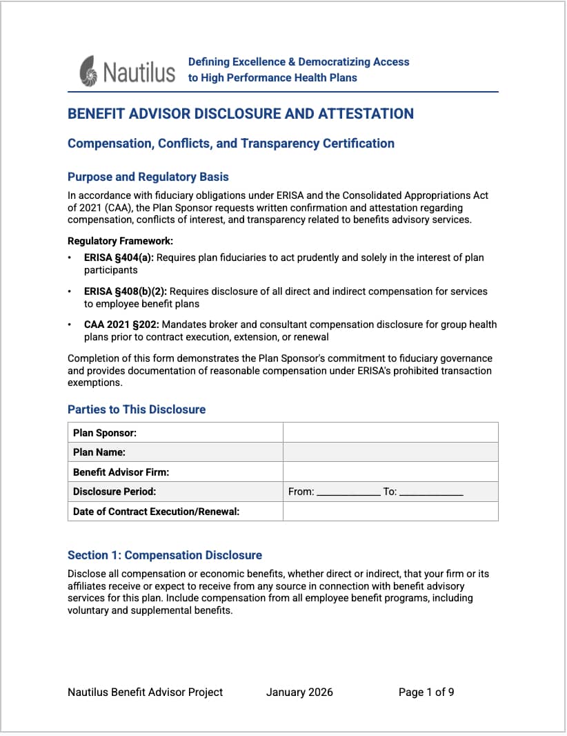 Here’s the latest Nautilus Benefit Advisor Disclosure and Attestation form. You should download and use this editable template now but remember: the law requires you to receive disclosures “reasonably in advance” of each renewal.